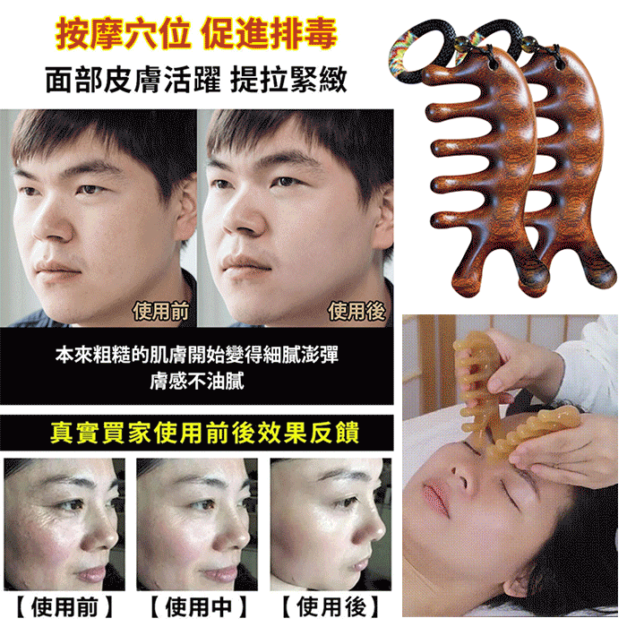 5分鐘前天然檀木美容經絡按摩梳 ◀頭臉按摩◀疏通經絡◀刮痧排毒 按摩穴位促進排毒,面部提拉緊緻 - 【疏通經絡,刮痧排毒】3入組HK$296
